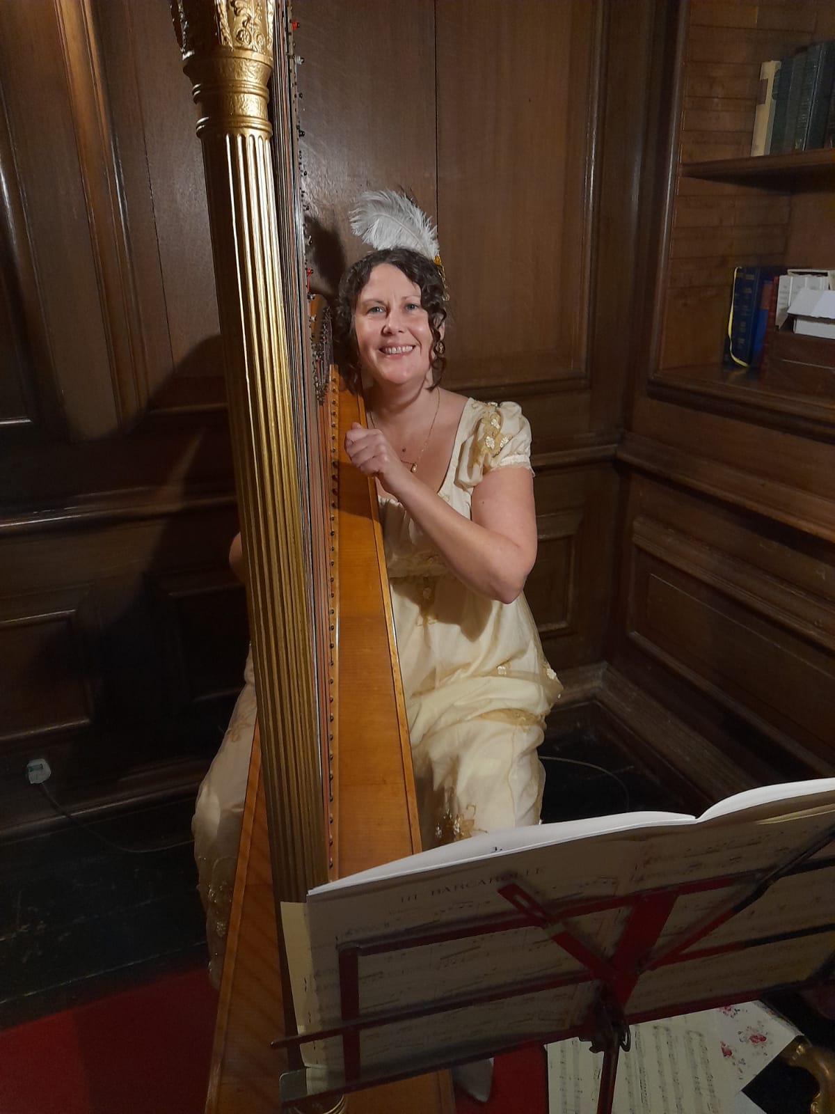 Two quick glimpses from Bath — Annemarie in Regency dress on harp, captured by Visit Bath.