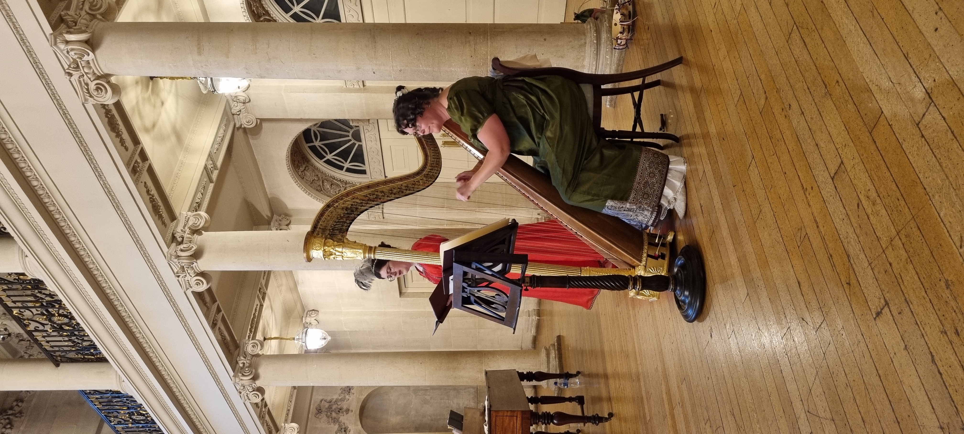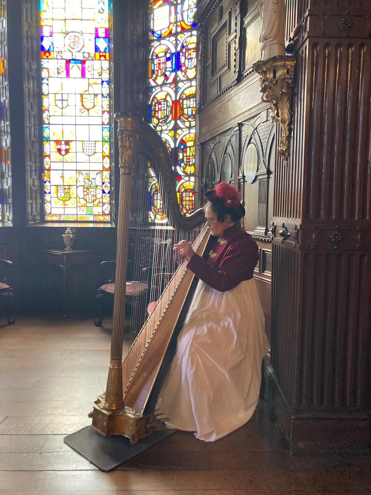 To deepen that authenticity, Annemarie learned the harp—an instrument fashionable in the Georgian and Regency era. With her 1814 Erard harp (affectionately called “Oriana”), she recreates Georgian and Regency sound worlds in historic settings, singing repertoire from the period and accompanying herself. Since 2013 she has appeared at Regency and Georgian events worldwide, in costumes she sews herself—always with a passion for hats.